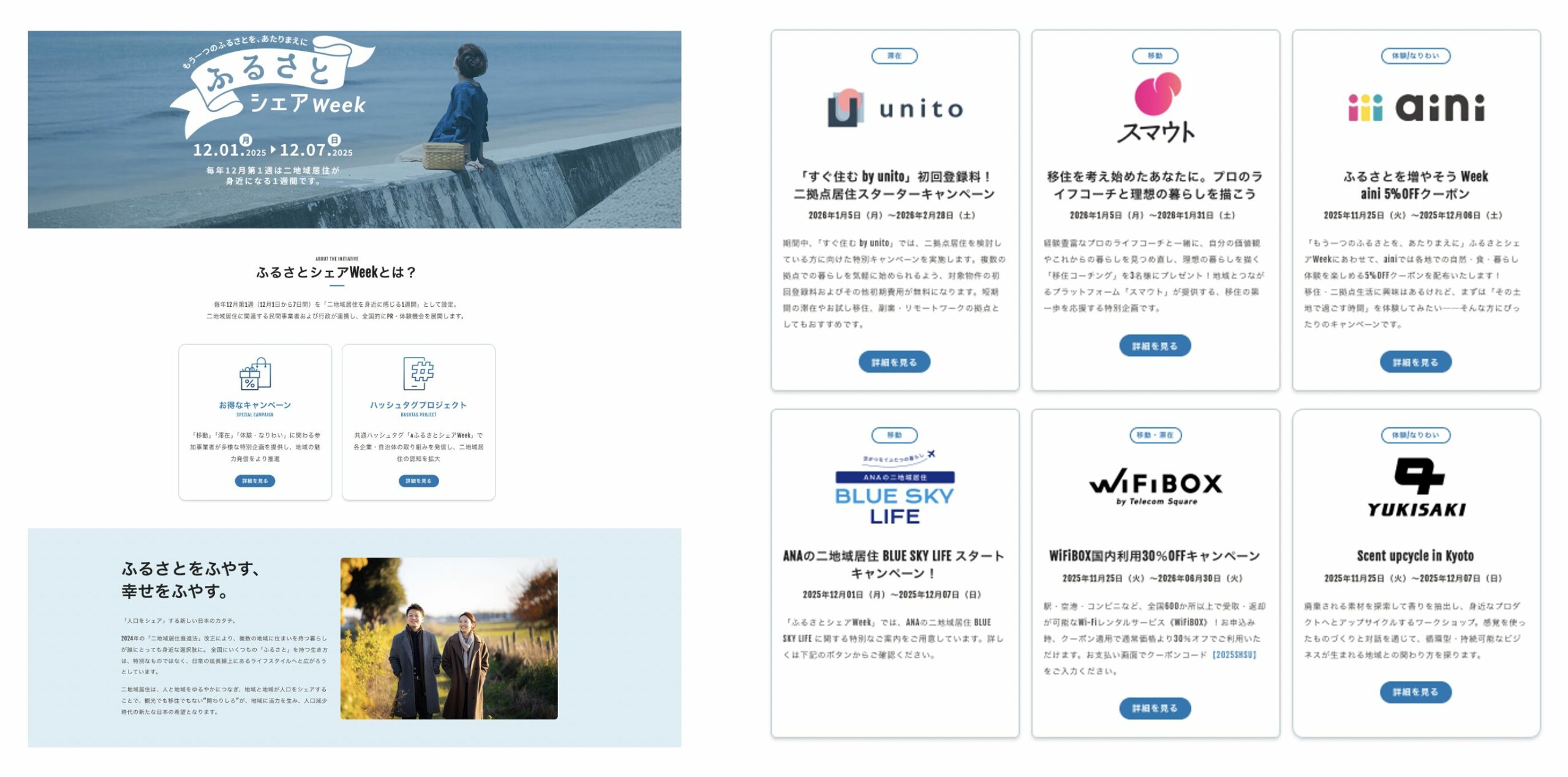 「ふるさとシェアWeek」は、企業・行政・自治体が連携し、12月1日〜7日の一週間を「二地域居住を身近に感じる1週間」として過ごす二地域居住を広げる全国的な一大ムーブメント