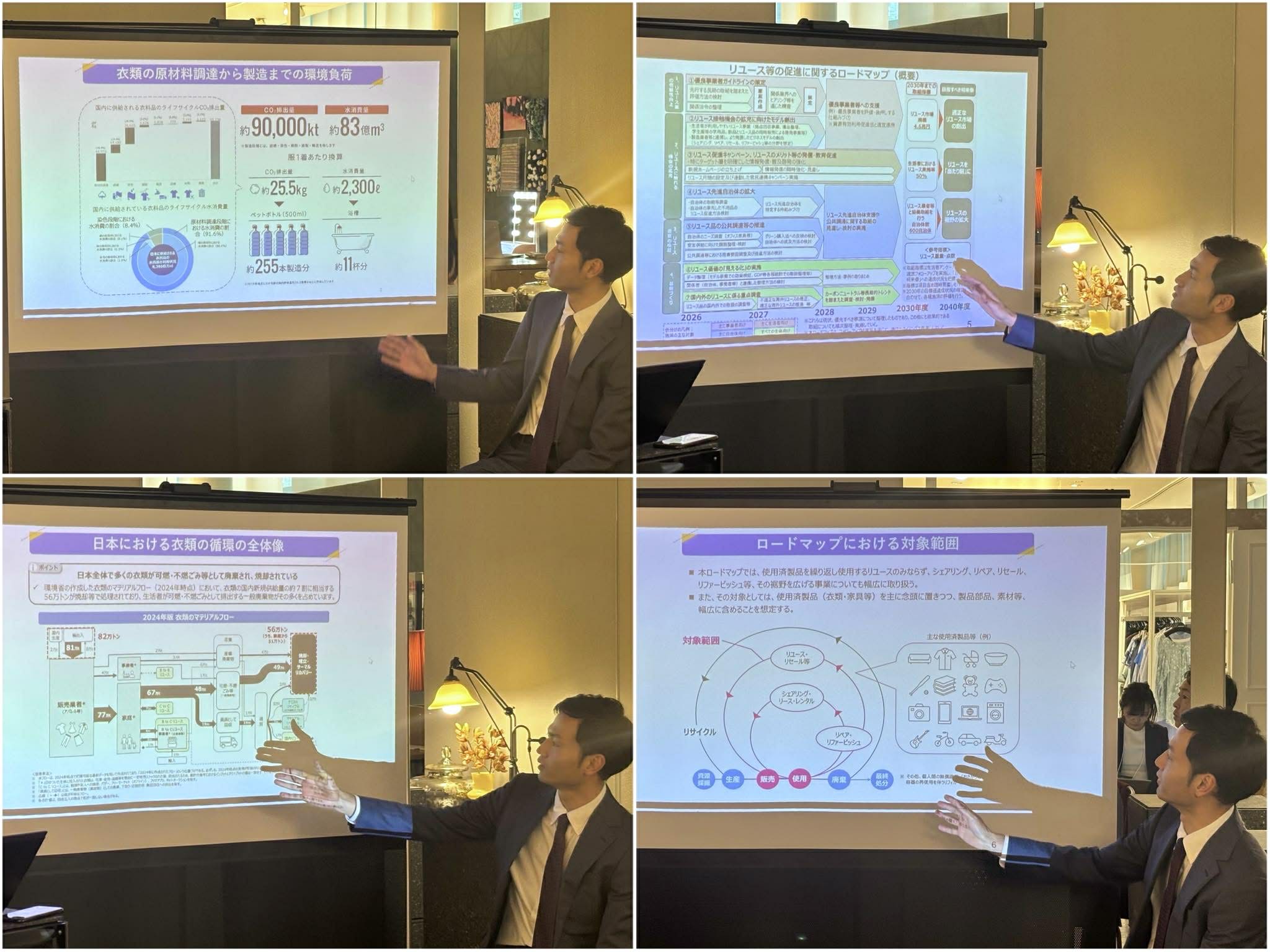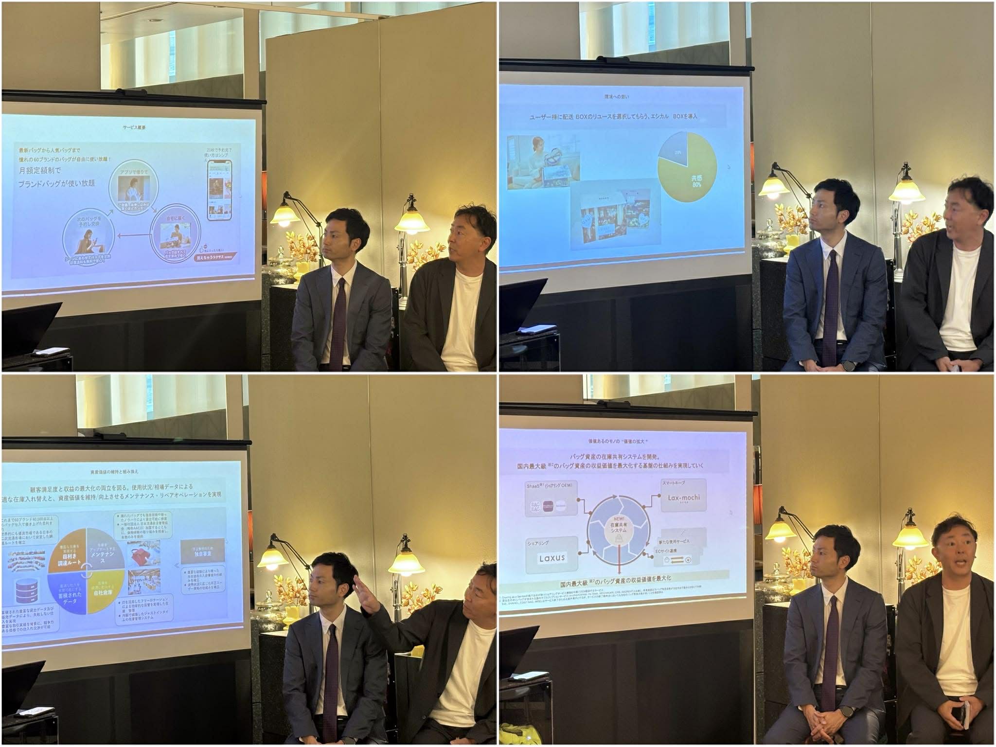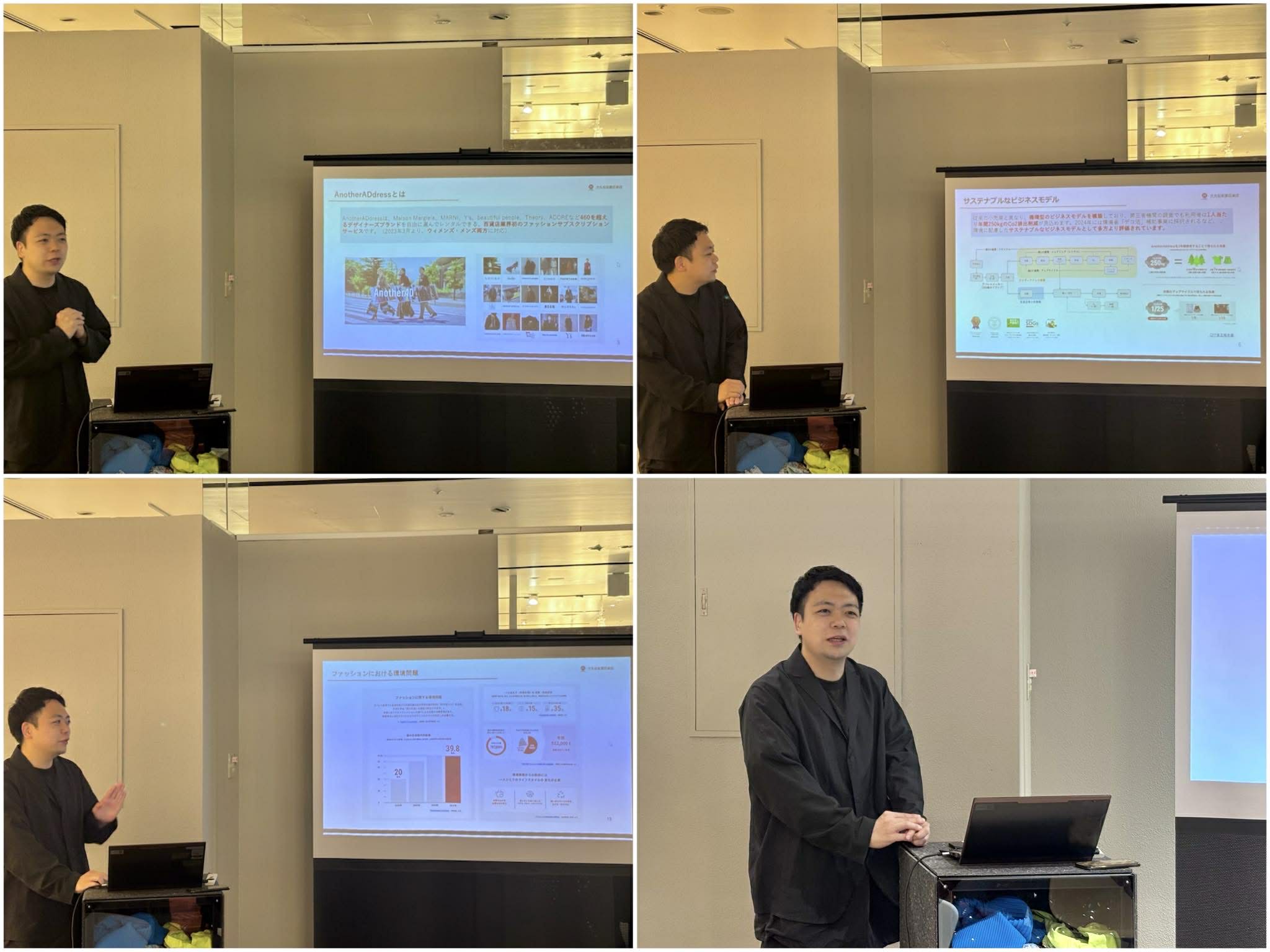 登壇者が実際にファッション・バッグ・ヘアアイロンのシェアサービスを活用し、普段の通勤スタイルから華やかな装いへと変身していく様子を実況形式で紹介。シェアサービス活用による心理的・機能的なメリットを、視覚的にも分かりやすく可視化しました。