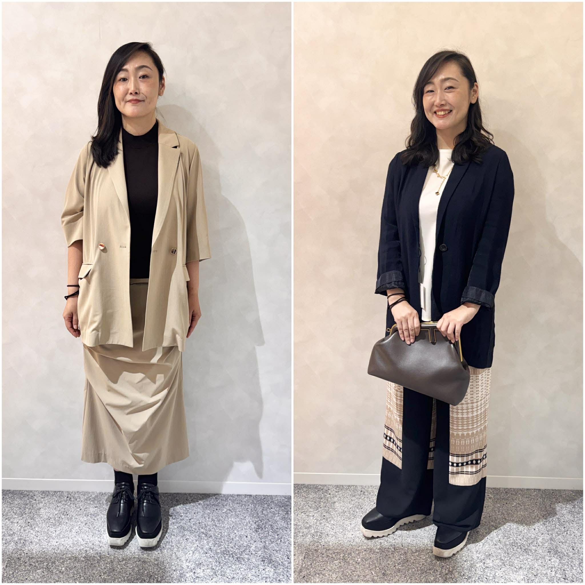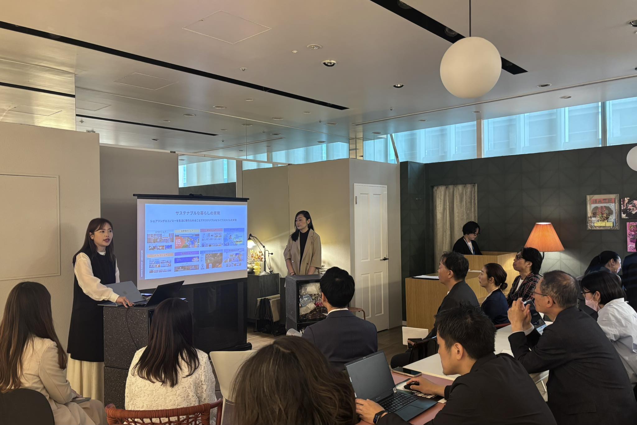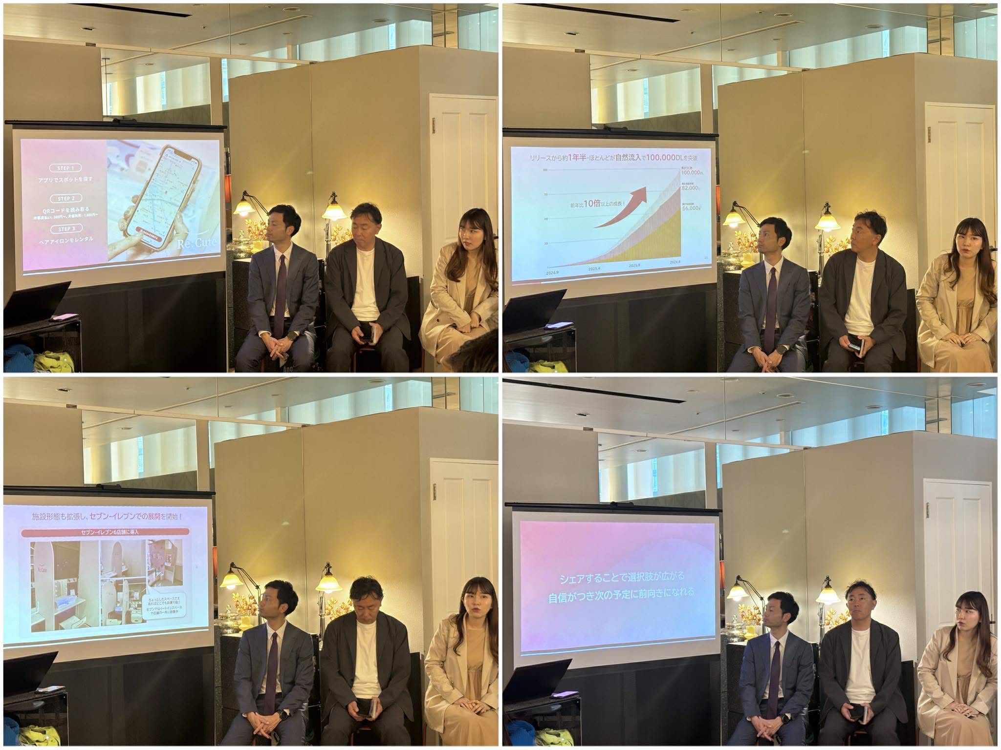 登壇者が実際にファッション・バッグ・ヘアアイロンのシェアサービスを活用し、普段の通勤スタイルから華やかな装いへと変身していく様子を実況形式で紹介。シェアサービス活用による心理的・機能的なメリットを、視覚的にも分かりやすく可視化しました。